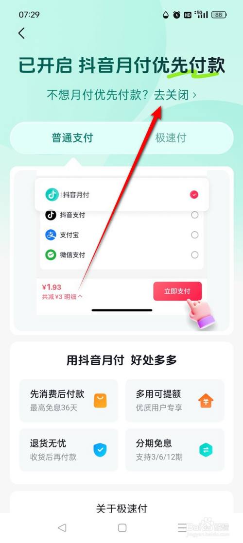 将"优先付条目设置"旁的小滑块点暗即可封闭。