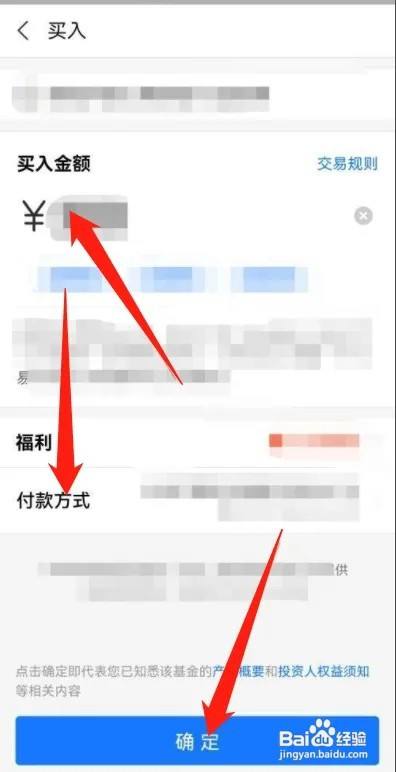 第七步:输入采办的金额,选择付条目方式,最后点击"确定"即可买入股票型基金。