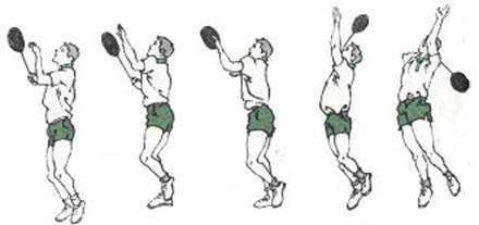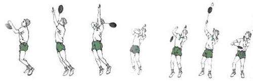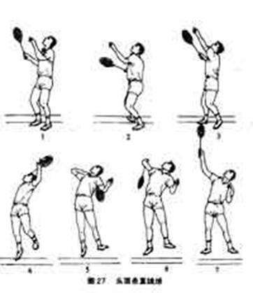起跳背工腕节制球拍瞄准来球路线,快速挥拍击打球的后部,球即沿着直线飞行;若手腕节制拍面击球托的右下方,球则沿着对角线偏向飞行。击球后,手臂随惯性天然收受接管至胸前。如图: