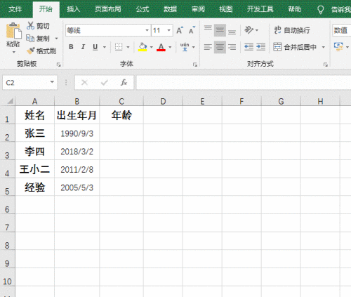 主动计较其他人的春秋,当鼠标放在C2单位格右下角呈现十字形,按住Ctrl键不放再按住鼠标左键不放,标的目的下拖动后,松开键盘,鼠标后其他人的春秋就主动计较出来了。
