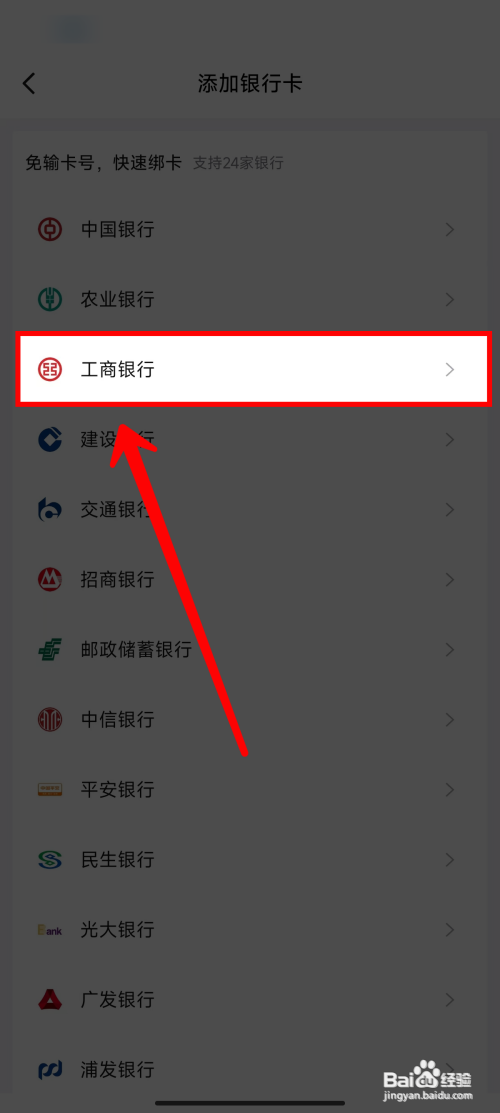 进入添加银行卡页面后,选摘要添加的银行名称。