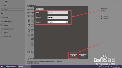 - 6、在创建窗口输入设置的密码后点击【下一页】。