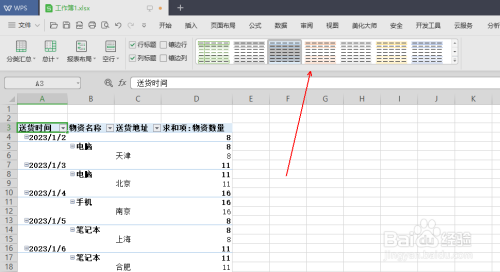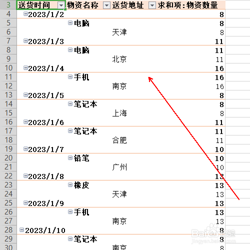 在《数据透视表区域》的行区域中依次选择《送货时间》、《物资名称》、《送货地址》三个选项,在值区域放置《物资数目》选项。