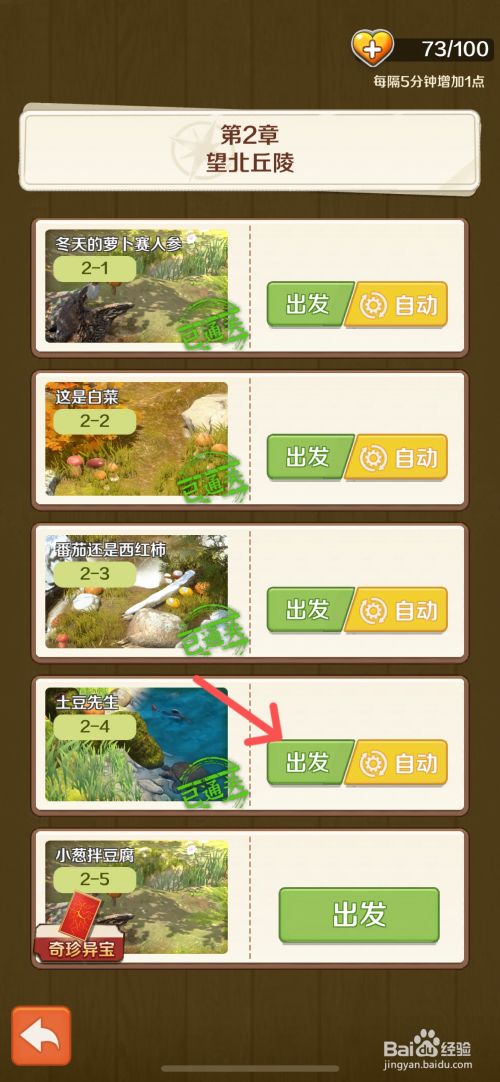 工具/原料iPhone13iOS17.4.1赶山赶海开饭馆1.9.0方法/步骤1先打开游戏进入饭馆,点击饭馆下的‘赶山’2如下,点击进入【望海说神聊丘陵】3接着,点击土豆师长教师的"出发"4如下,进入草丛中,找到土豆点击5如下,沿草皮处下滑6接着,把土壤扒开后,点击【挖出】7如下,即可乐成挖出土豆了END