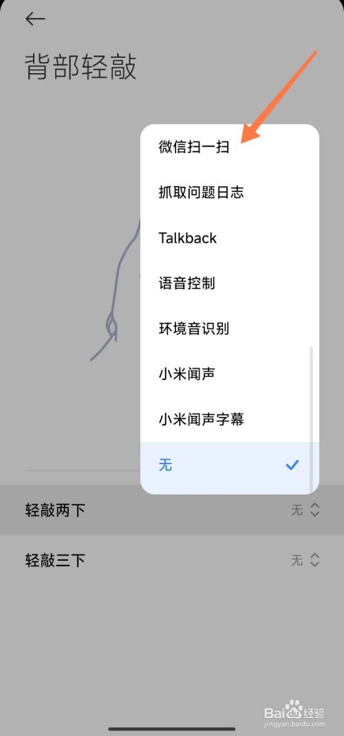 第五步:打开背部小扣设置界面,可以选择小扣两下或三下,例如点击【小扣两下】。