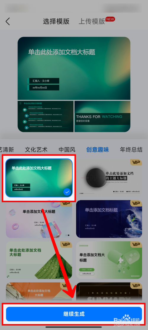 在打开的页面中,选择一个PPT模板,再点击【继续天生】。