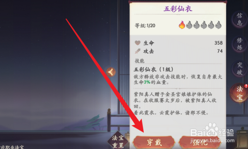 工具/原料黑鲨6JOYUI13西游笔绘西行1.02.05方法/步骤1点击右下方的脚色选项2选摘要穿着法宝的脚色并点击3点击右下方的详情选项4点击右侧的法宝选项5点击左侧的加号图标6选择可以穿着的法宝并点击7点击右下方的穿着选项即可END