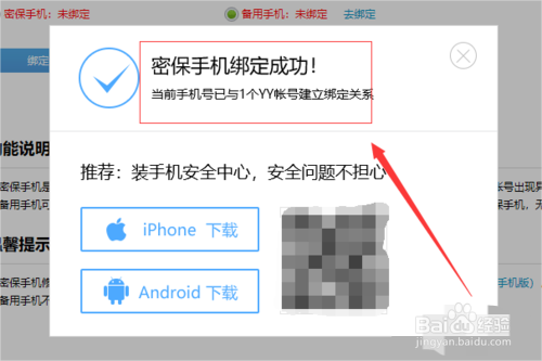 提醒密保手机绑定乐成,这样就在电脑端上给YY账号绑定了【手机号】。