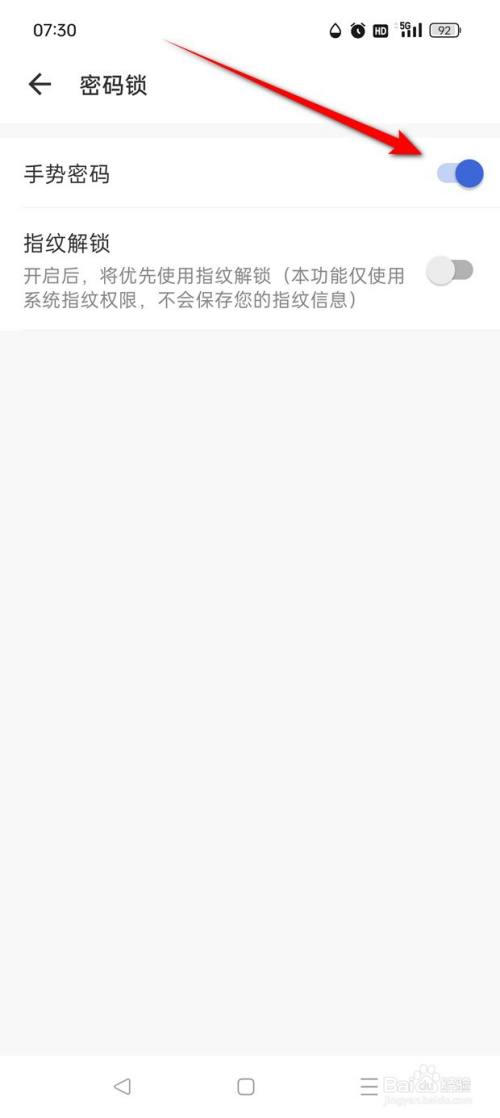 设置完当作,将"手势密码"旁的小滑块点亮即可开启。