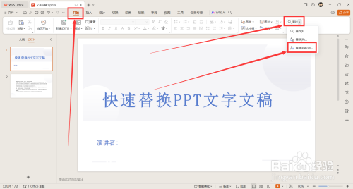 - 1、在【起头】选项下点开【查找】东西的选项卡,点击选项卡中的【替代字体】。