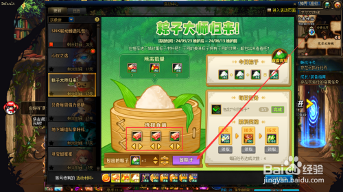 工具/原料联想E480windows10地下城与勇士34.3.3.16方法/步骤1进入地下城与勇士,点击粽子巨匠。2点击打开运动窗口。3点击查看食谱,查看哪个是生命值和邪术值的粽子。4选择对应的食材,选择数目,点击包粽子。5查看邮箱得到生命值和邪术值的粽子。END