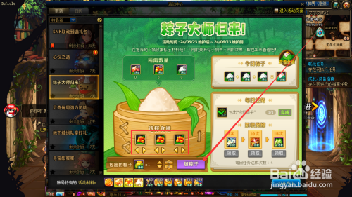 工具/原料联想E480windows10地下城与勇士34.3.3.16方法/步骤1进入地下城与勇士,点击粽子巨匠。2点击打开运动窗口。3点击查看食谱,查看哪个是增长气力和智力的粽子4选择对应的食材,选择数目,点击包粽子。5查看邮箱得到加危险的粽子END