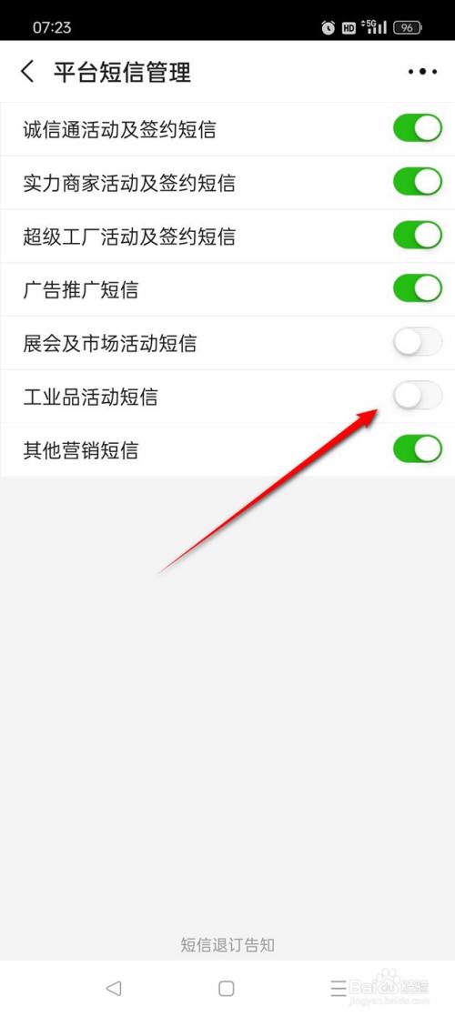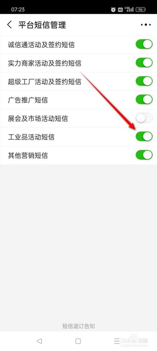 将"工业品运动短信"旁的小滑块点亮即可开启。