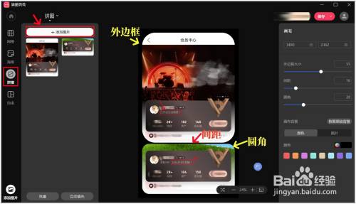 在编纂右面调解画布尺寸,拖动进度条调解外边框、间距、圆角等数值,选择想要的配景色即可。