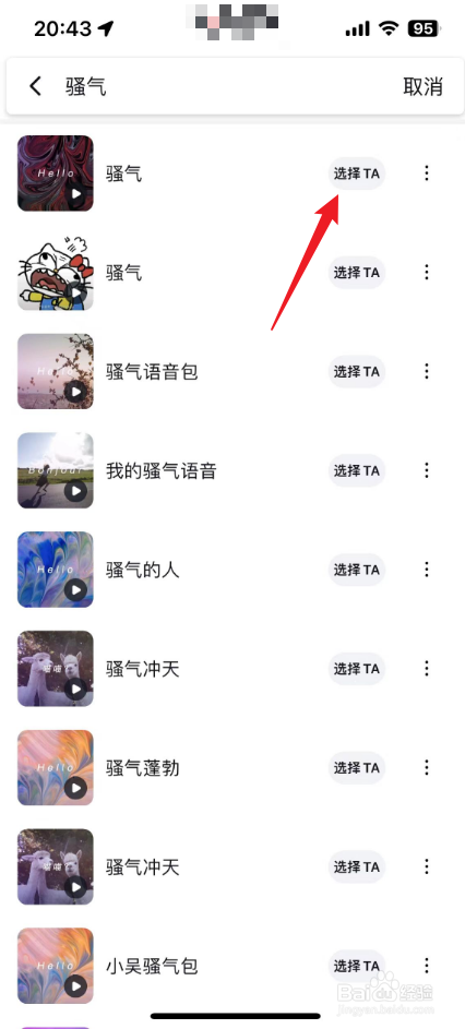 进入到搜刮成果界面,选择骚气语音,点击"选择TA"。