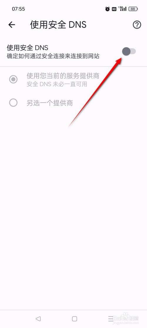 将"利用安全DNS"旁的小滑块点亮,点选"利用你当前的办事供给商安全DNS未必一直可用"或"另选一个供给商"即可许可启用。