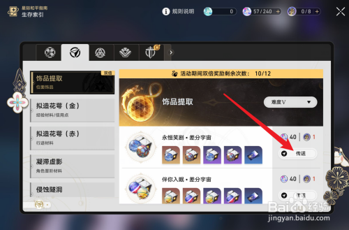 工具/原料苹果15iOS16.1崩坏星穹铁道2.3.1方法/步骤1进入游戏界面,点击旅情事记2进入旅情事记界面,点击位面破裂3进入位面破裂界面,点击饰品提取4进入饰品提取界面,点击传送5进入关卡详情界面,点击起头挑战6完当作挑战,即可领取得到流萤双倍遗器END