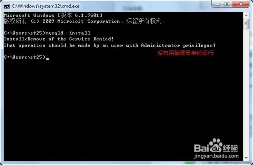输入mysqld-install(要是不消办理员身份运行,将会由于权限不敷而呈现错误:Install/Remove of the Service Denied!)