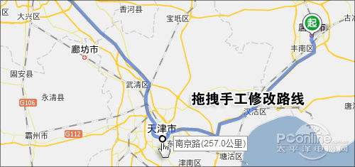 此外,百度地图许可用户经由过程手工修改方案。好比当我们需要姑且颠末天津市区时,就可以直接用鼠标将线路图拖拽到想颠末的路子点,松手之后,百度地图将主动从头规划整条线路并修改驾车方案,整个操作方便极了。(手工拖拽修改路线)