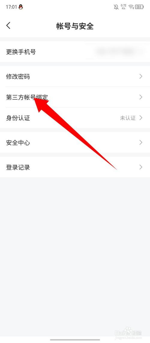 在帐号与净惹霸安全页面,点击第三方帐号绑定选项。