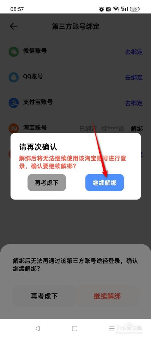 再次点击"继续解绑"即可解绑淘宝账号。