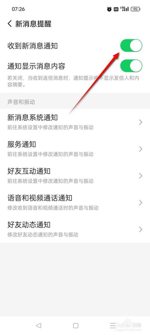 将"收到新动静通知"旁的小滑块点亮即可开启。