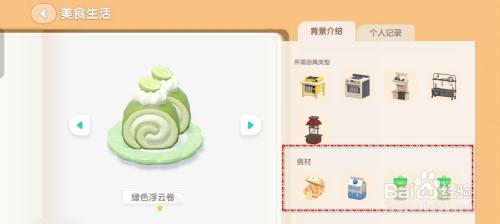 由图鉴可知:绿色浮云卷可用鸡蛋及牛奶各一份、绿色糖2份在灶台烹制得到。