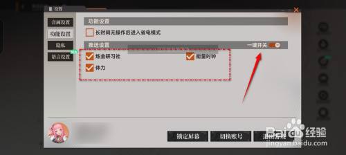 将"一键开关"旁的小滑块点亮,勾选"炼金研习社"、"能量时钟政茄特"及"体力"后即可开启推送。
