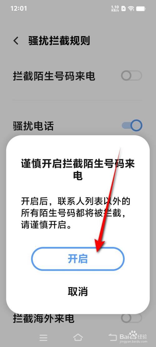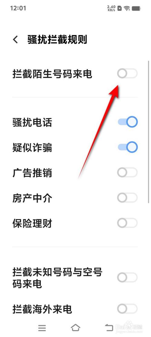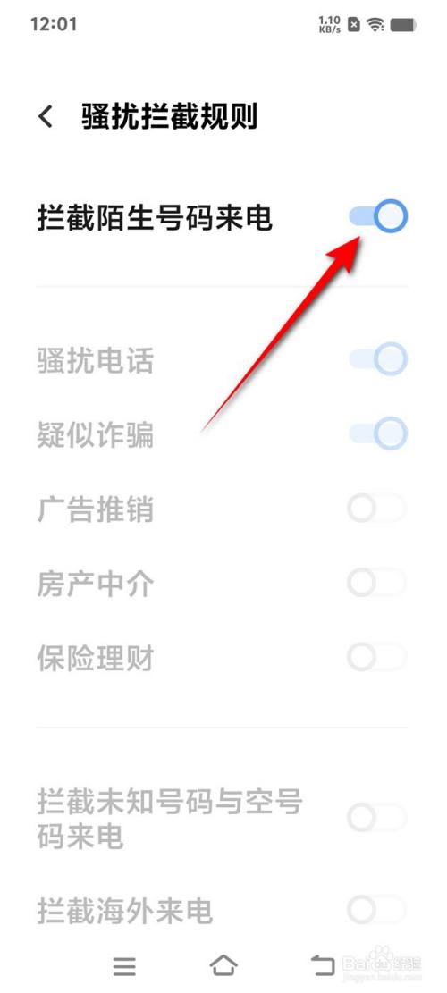 将"拦截生疏号码来电"旁的小滑块点亮即可开启。