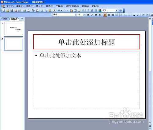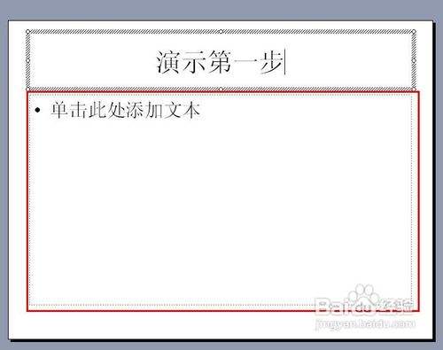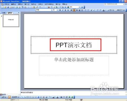 如图,红框是PPT的主标题,我们填入"PPT演示文档"