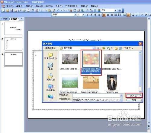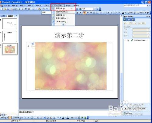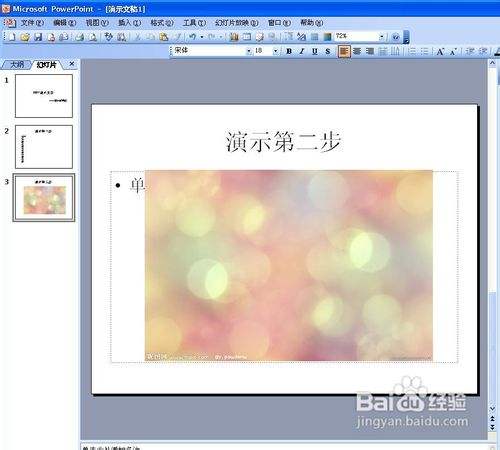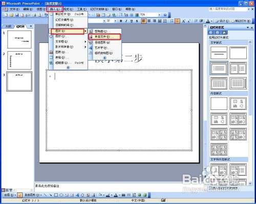 再新建一个幻灯片,在标题填入"演示第二步",然后鄙人方文本框我们测验考试插入图片。点击插入——图片——来自文件