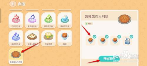 点选"奶黄流心大月饼"食谱,筹办3个月饼及1份牛奶,点击"起头烹调"。