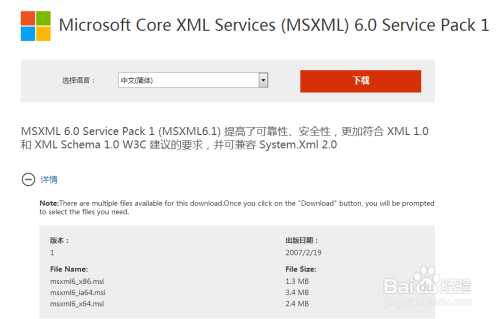 下载MSXML 6.0,在微软官方下载中间就能下载。或者在百度上搜刮下载msxml6_x86.msi和msxml6_x64.msi。32位体系只用下载msxml6_x86.msi。