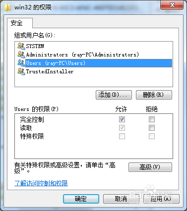 将您本身的用户权限设置为完全节制,即在悦近完全节制右边的许可下面的方框打上勾。完当作后点击应用,再点击确定。