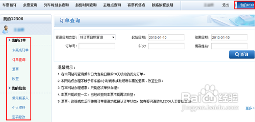 登录网站乐成以后,点击网页右上角的"我的12306"按键,在左侧的功效列表中就有订单查询、退票、改签、修改密码等等。