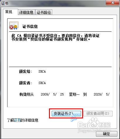 双击证书文件,弹出安装界面 ,点击"安装证书"