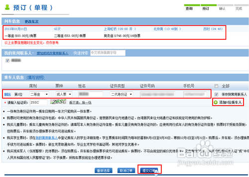 选择好想要乘坐的列车,然后点击该车次最后面的蓝色"预定"按键,转到"预定"界面,按照列车的信息,填写搭车人的需要的列车席别、乘坐人身份证号码等,要是是采办多张车票则每张车票需要填写一个身份证号码。填写完备后,点击网页底部的"提交订单"按键。