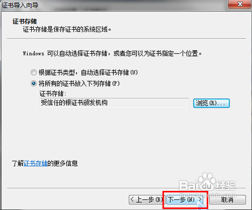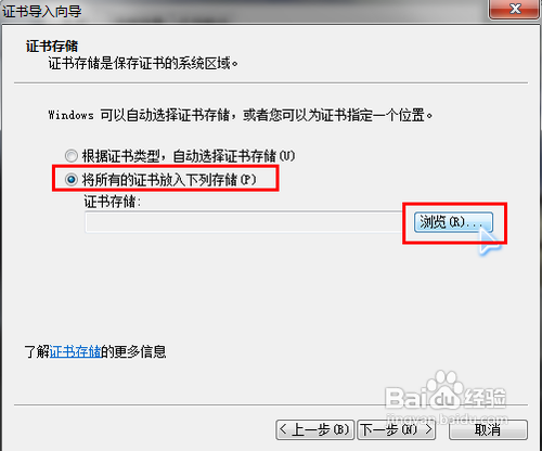 弹出"证书存储"界面,选择"将所有证书放入下列存储",然后点击"浏览"