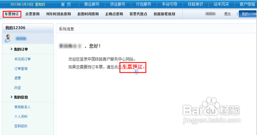 登录乐成,直接进入"我的12306"界面 ,点击红色的"车票预定"
