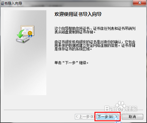 弹出"证书导入标的目的导" 界面,点击"下一步"