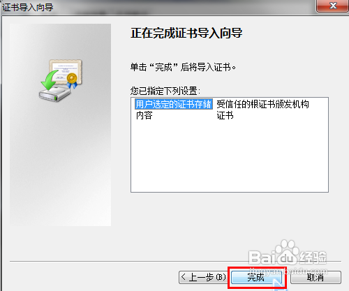 转入"正在完当作证书导入标的目的导"界面点击"完当作"