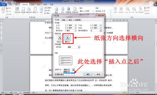 在页面设置窗口中,首先将纸张偏向设置为横标的目的,然后选择"应用于插入点之后"。
