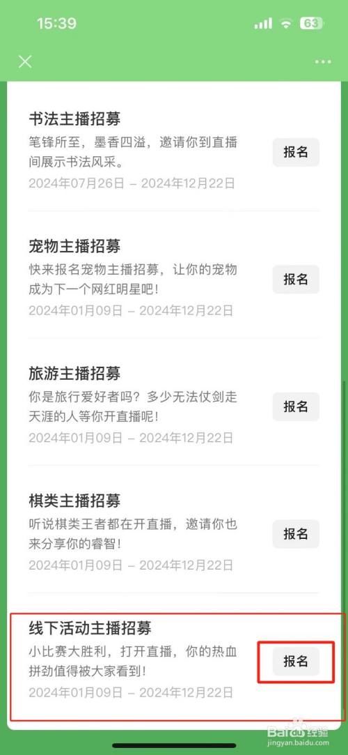 找到‘线下运动主播招募’选项,点击后面的【报名】选项即可。
