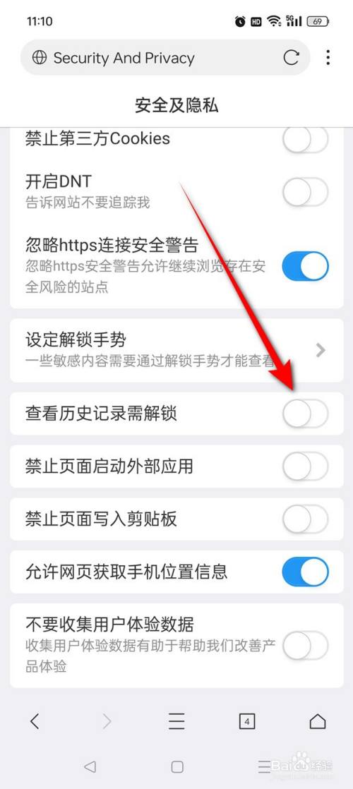 将"查看汗青记载需解锁"旁的小滑块点暗即可封闭,此时点击小滑块。