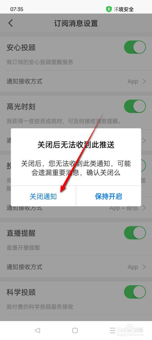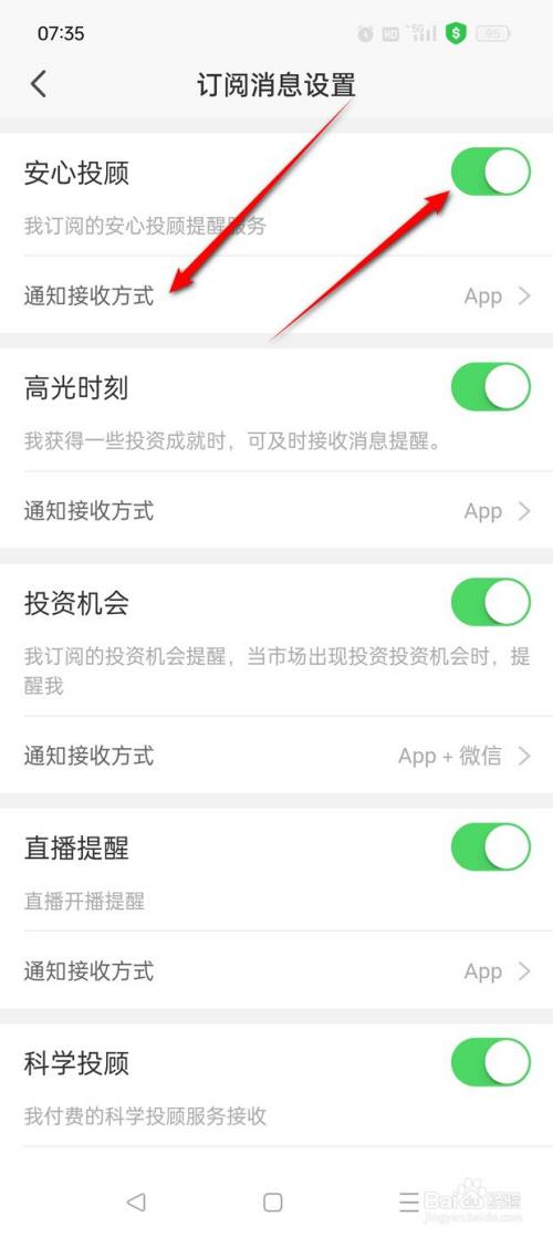 将"放心投顾"旁的小滑块点亮并完美通知吸收方式即可开启,此时点击小滑块。