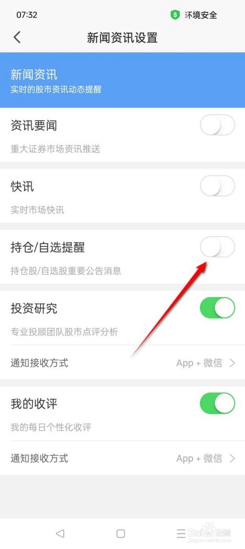 将"持仓/自选提示"旁的小滑块点亮,再点击完美通知吸收方式即可开启,此时点击小滑块。