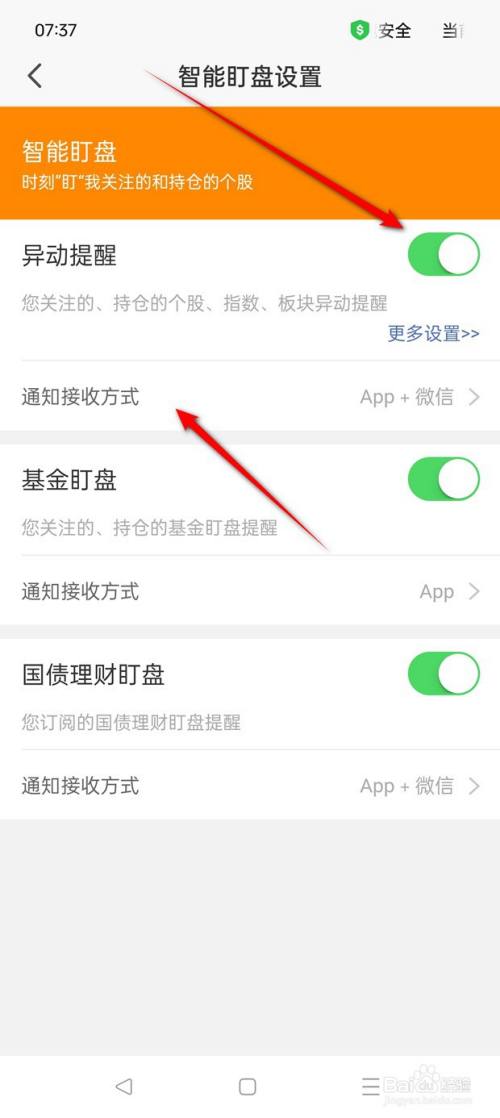将"异动提示"旁的小滑块点亮并完美通知吸收方式即可开启,此时点击小滑块。