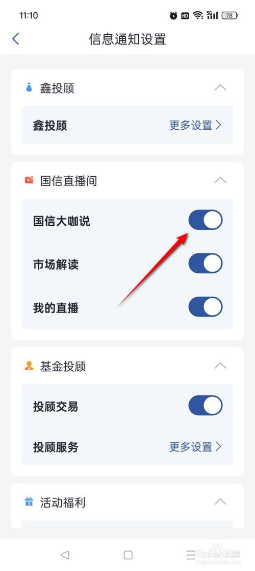 将"国信大咖说"旁的小滑块点亮即可开启,此时点击小滑块。