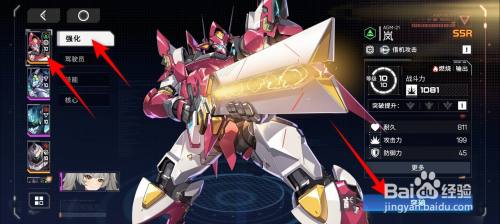 点选一个机甲,点击选中"强化",点击"冲破"。
