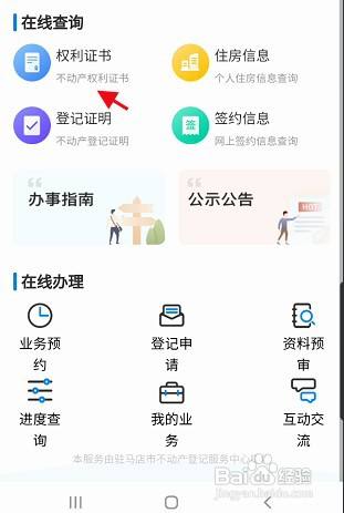进入不动产,找到下方的在线查询,点击权力证书进入查看不动产权力证手札息